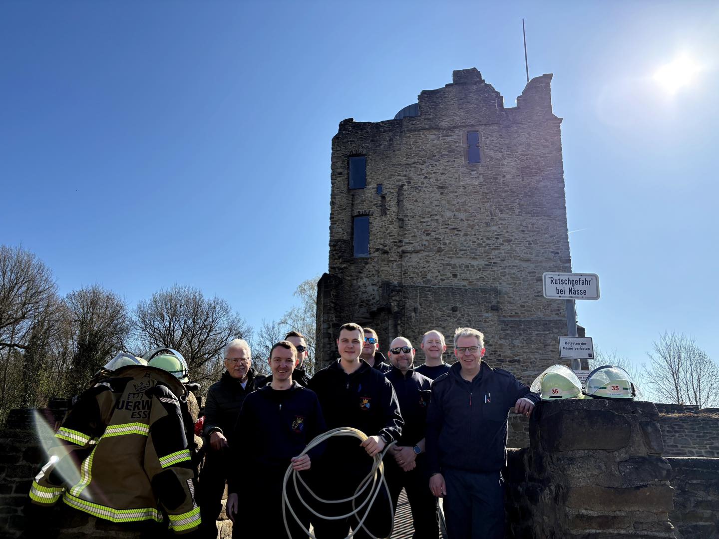 Der Austausch der Beleuchtung erfolgte am vergangenen Samstag (21.3.26) mit Unterstützung der Freiwillige Feuerwehr Burgaltendorf. In rund 25 Metern Höhe auf dem Burgturm wurde die neue Lichterkette entlang der Zinnen angebracht. Für die Einsatzkräfte bot sich dabei zugleich die Gelegenheit unter Bedingungen in großer Höhe zu üben.